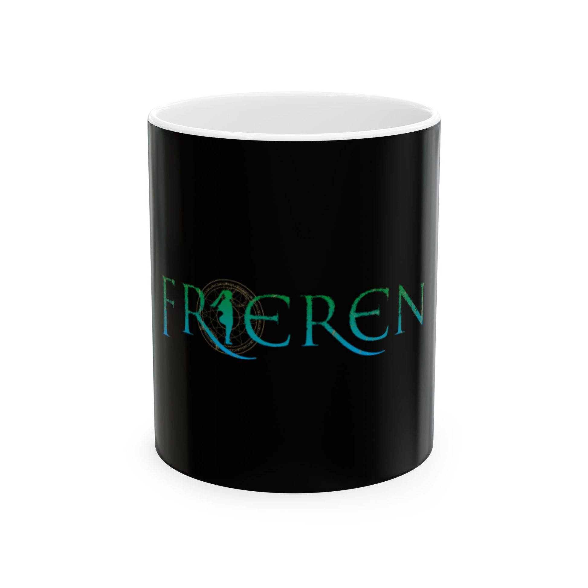 The mug displays the iconic Frieren logo along with a subtle magical circle motif, creating a minimalist yet striking design. Its deep black aesthetic blends perfectly with any kitchen décor or anime merchandise setup, making it a must-have for collectors.